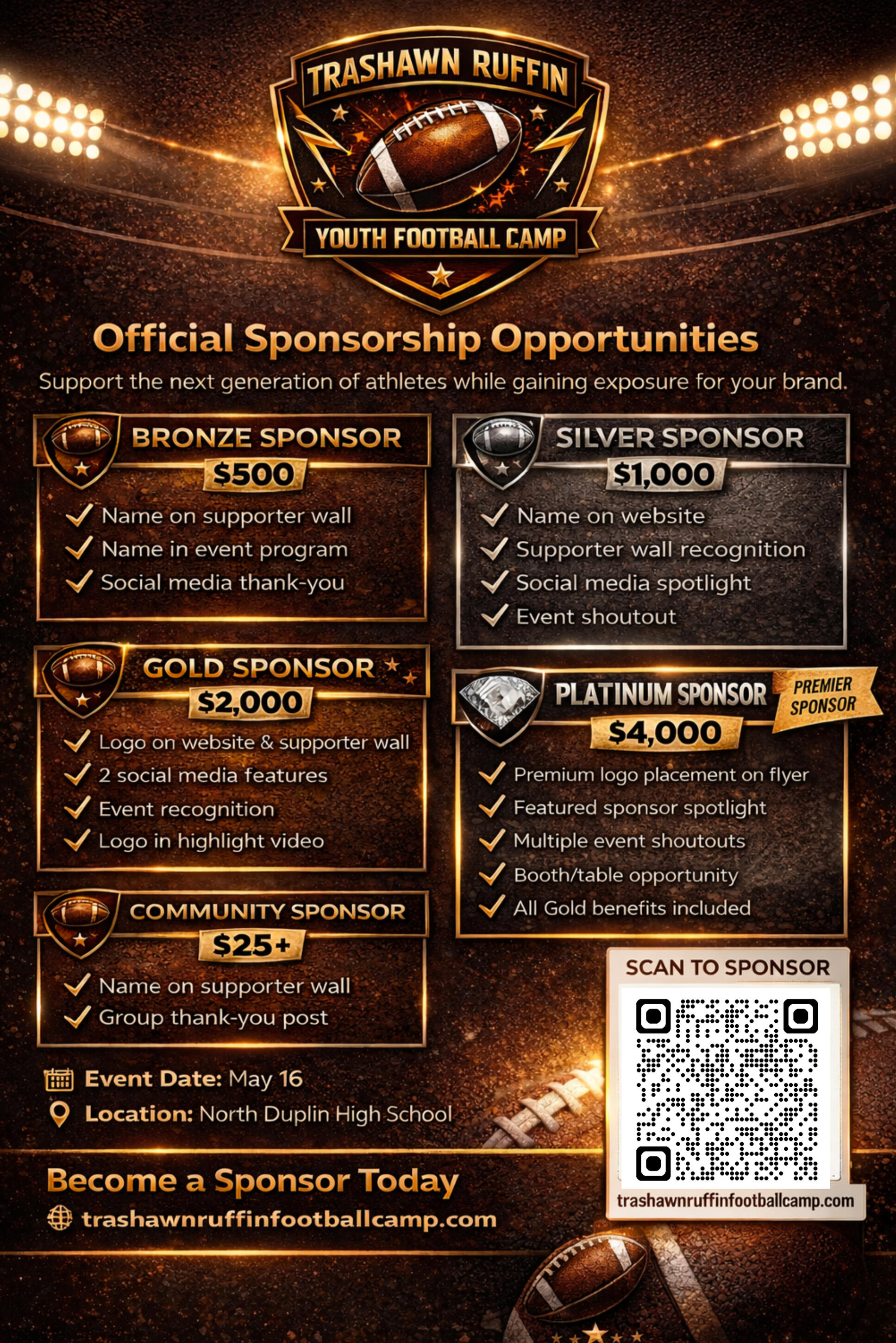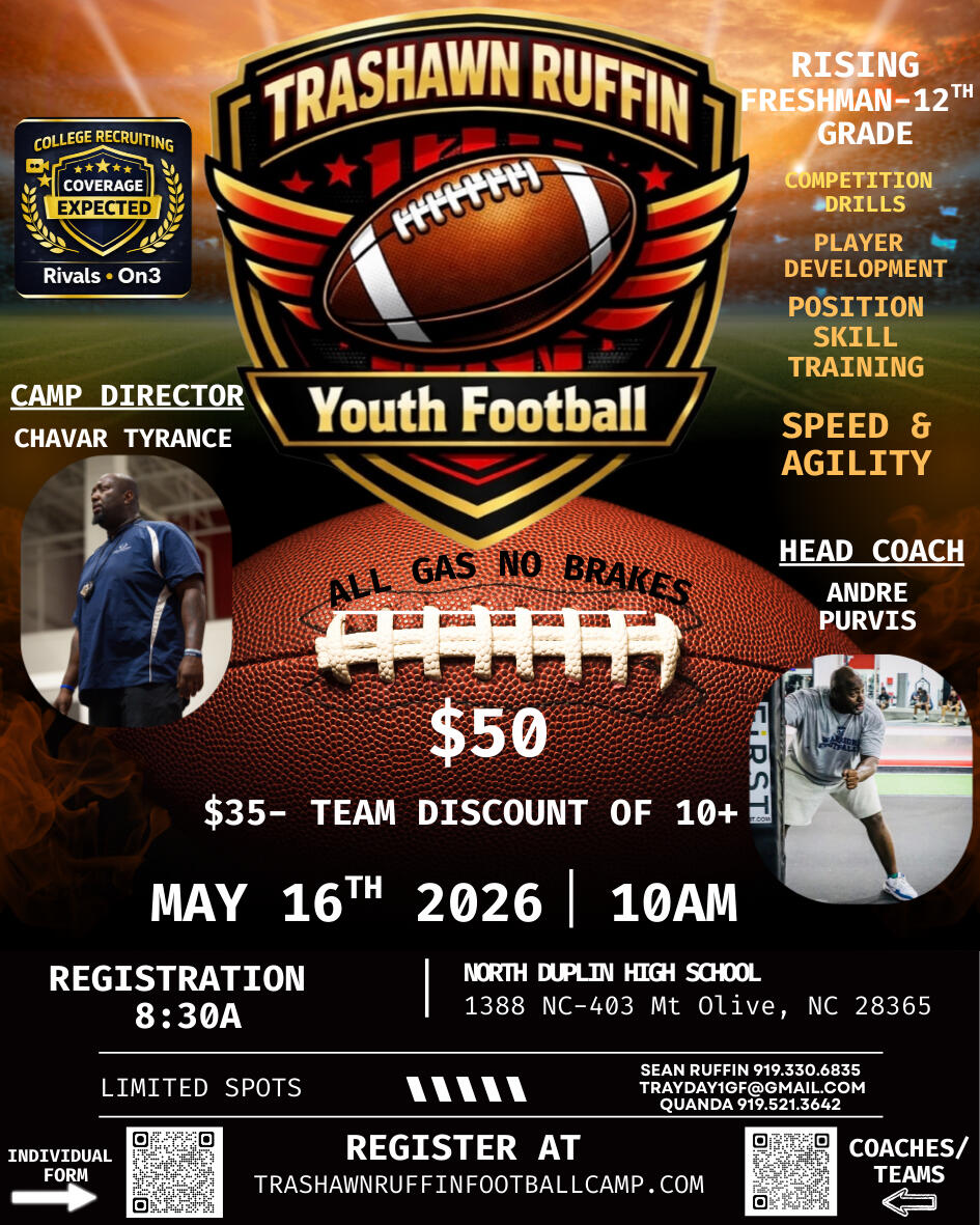 If you have any questions prior to the camp, please contact the camp organizers.We look forward to a great day of football and development!Sean Ruffin 919-330-6835 ([email protected])Quanda Pretty 919-521-3642 ([email protected])